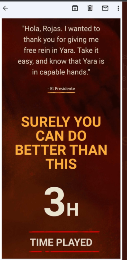 The emails are told from the point of view of the game’s main antagonist Anton Castillo, played by the actor Giancarlo Esposito of Breaking Bad. The emails consist of Castillo antagonizing the main character Rojas for giving up on his journey of taking back the fictional Country of Yara. It then shows the players playtime with the caption saying they can play more