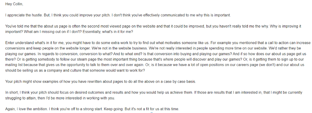 I did stray from this format sometimes. For example, if the game developer didn’t have a strong game catalog, I would sub that out for “I was on your website”. Though I mainly stayed the course.